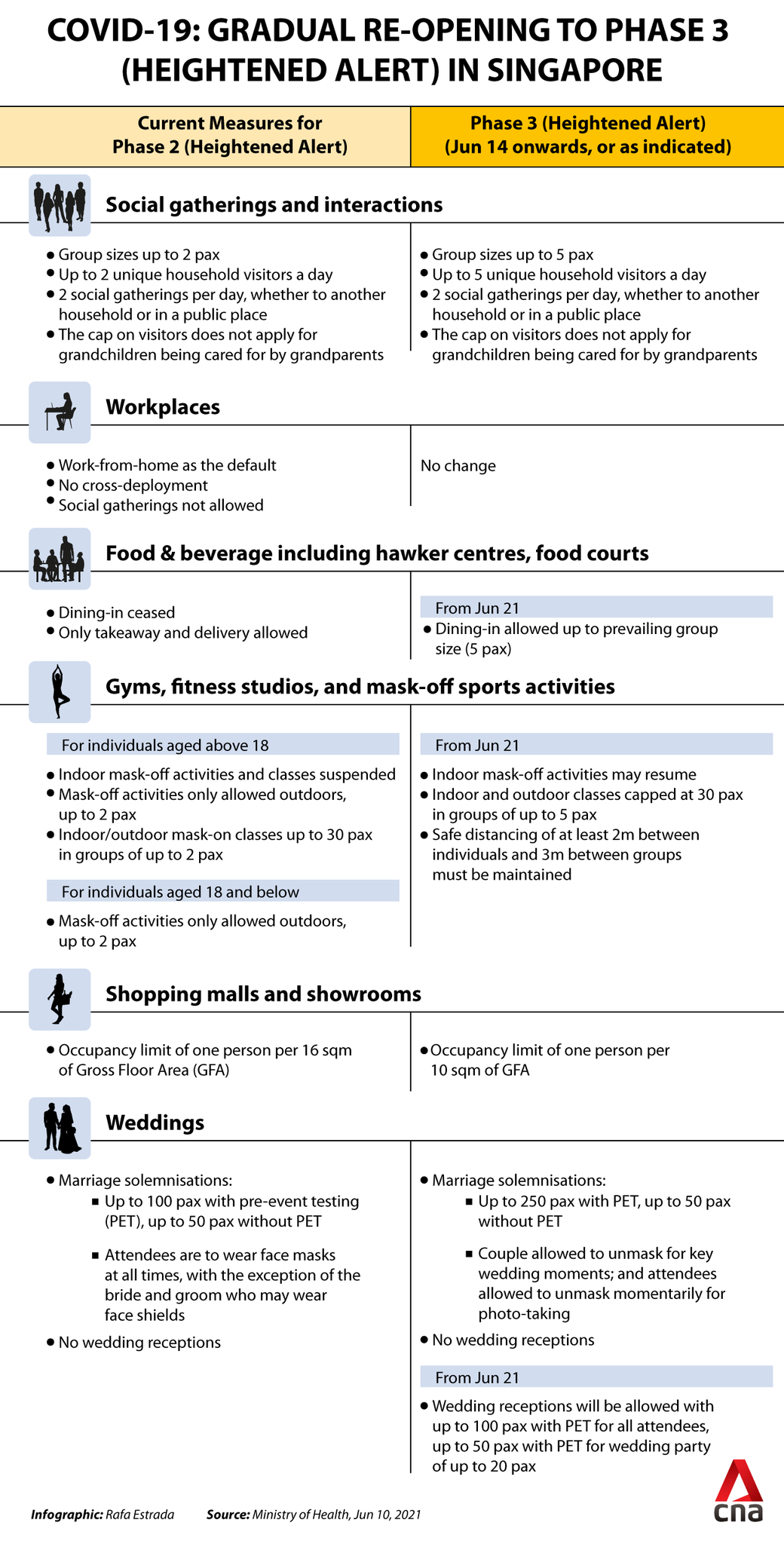 Singapore will allow most businesses to reopen on. Updates to Safe Management Measures in Phase 3 Heightened Alert from 12 July 2021 4. Singapore will be moving into Phase 3 from 28 December 2020.