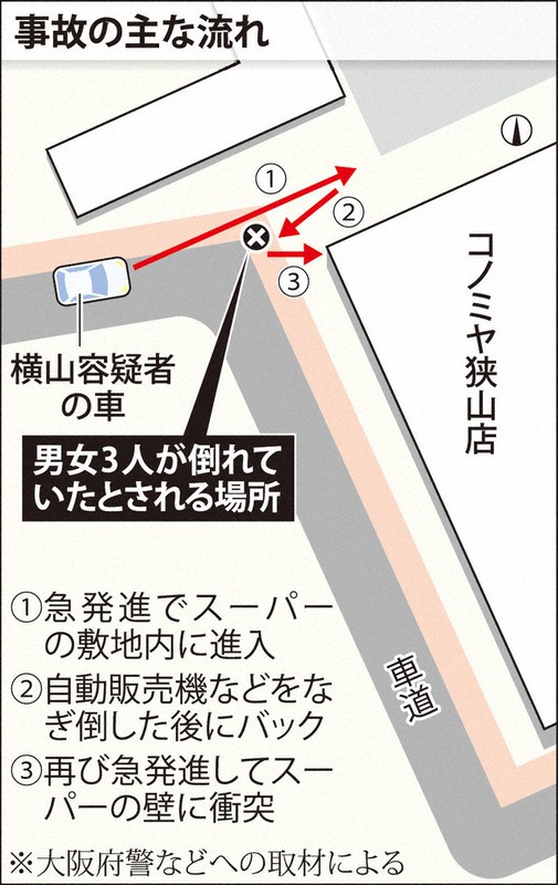 コノミヤ狭山店事故. 11月17日午後0時10分ごろ大阪狭山市大野台2にあるスーパーコノミヤ狭山店で高齢者が運転する車が暴走し男女3人が巻き込まれる事故が発生しました この事故で横山孝容疑者89歳が過失致傷の疑いで逮捕 男性1. コノミヤ狭山店車事故 20211118 11月17日大阪大阪狭山市のスーパーコノミヤ狭山店で車が暴走し男性1人が死亡し2人重傷となった事故で横山孝よこやまたかし89が過失運転致傷の現行犯で逮捕されました. 11月17日の正午過ぎ大阪狭山市大野台のスーパーマーケット コノミヤ狭山店の近くの路上で 警察官の職務質問中に車が急発進し歩行者を数人ひく事故が起きました 消防などによると少なくとも3人がケガをしていてうち2人が心肺停止の状態で病院に搬送されたということです.